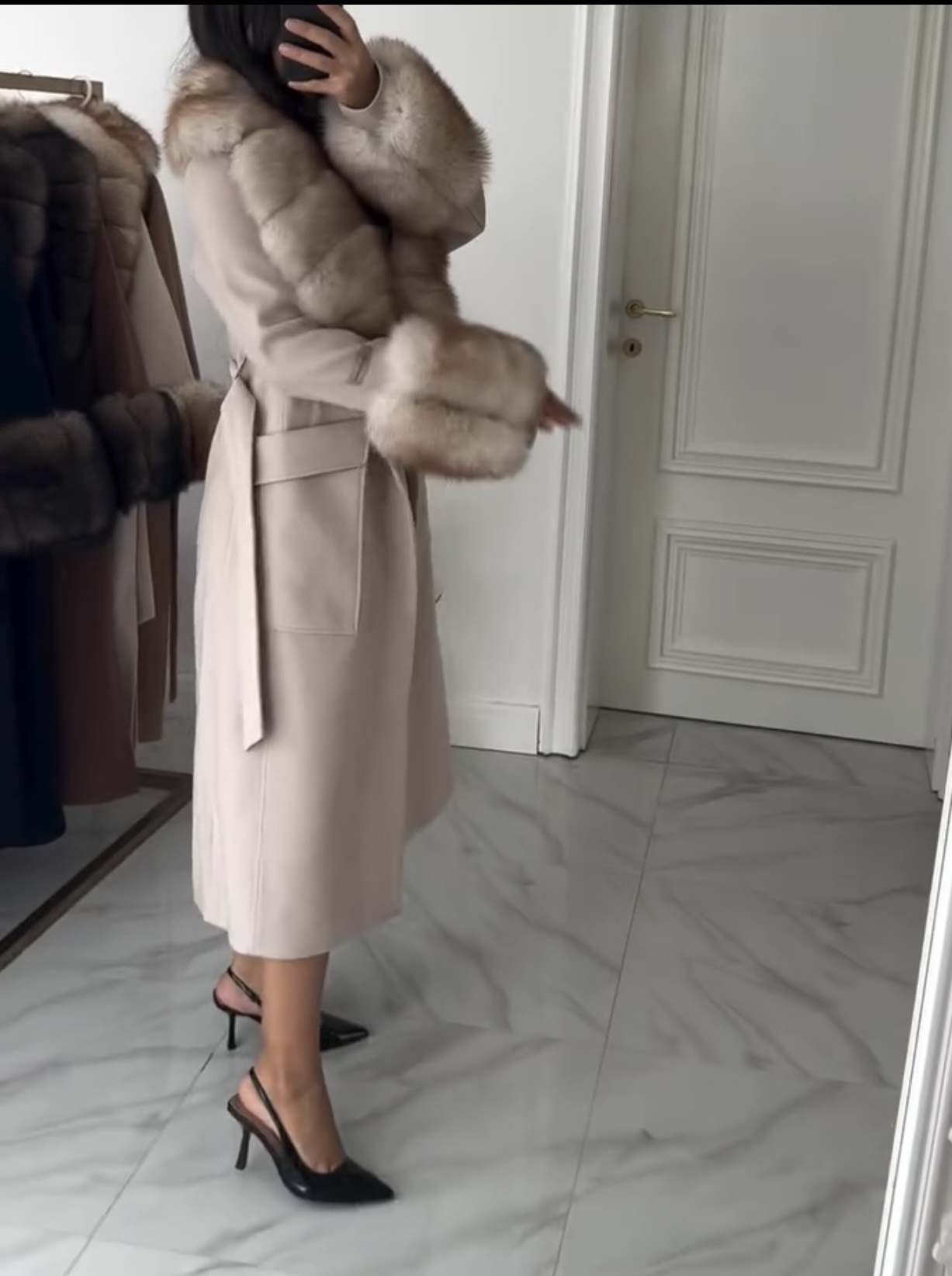 Elevate your look with our stunning cashmere coat adorned with fox fur accents. Luxurious and Sophisticated, this piece requires special care to preserve its beauty. Reach out to us for sizing guidance and embrace the ultimate in chic glamour